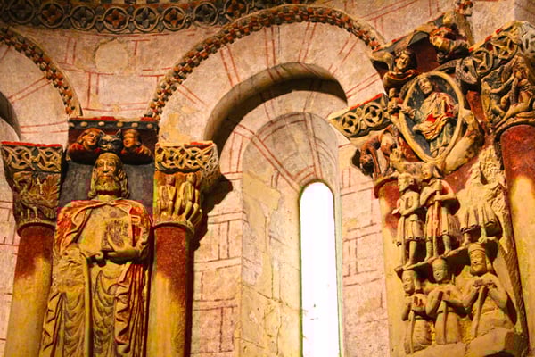 La villa de Turégano se encuentra en el centro de la provincia de Segovia asentada sobre un antiguo castro arévaco, posteriormente romanizado. Construido en el siglo XV, el castillo de la localidad vigila el caserío desde su loma, coronada por la espadaña del campanario que muestra que en su interior alberga una iglesia. Es la iglesia de San Miguel, templo románico de finales del siglo XII o principios del XIII sobre el cual se contruyó la fortaleza. Un siglo antes Turégano se había convertido en villa episcopal, cuando doña Urraca dona al obispo de Segovia estas tierras. Fue entonces cuando comenzó a construirse la iglesia de Santiago que acabó convirtiéndose en un templo barroco que durante siglos escondió detrás de su retablo rococó un ábside románico descubierto de forma casual en la década de los noventa. Recientemente restaurado y abierto al público, supone para muchos uno de los hallazgos románicos más sorprendentes de las últimas décadas en nuestro país, habiéndose recuperado parte de las esculturas originales y de sus pinturas policromadas.