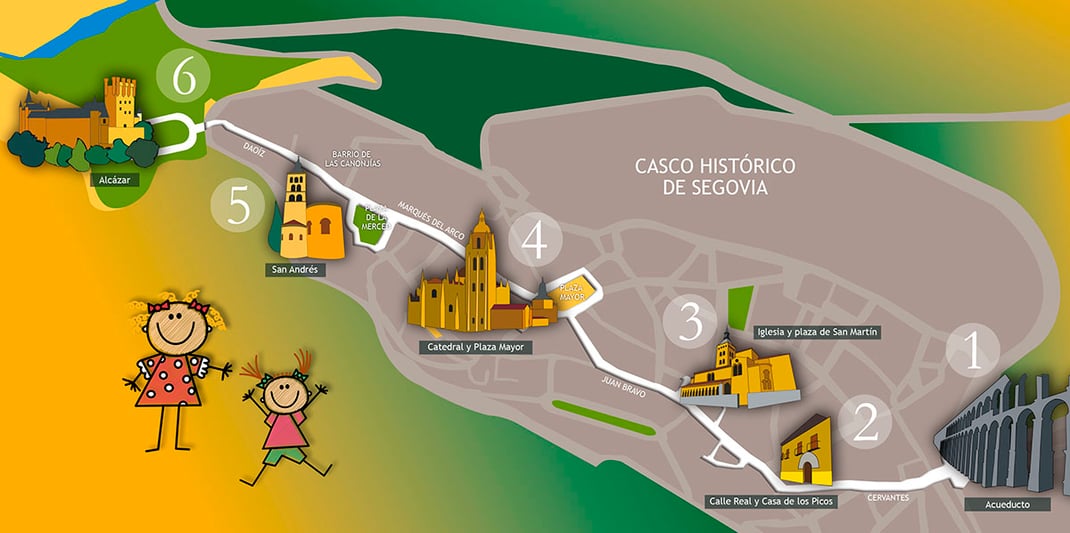 La visita comienza en el Acueducto o el Alcázar y recorre la Calle Real, con paradas en la Casa de los Picos, la plaza de Medina del Campo y la iglesia de San Martín. Continúa por la Plaza Mayor y la Catedral, pasa junto a la iglesia de San Andrés en la plaza de la Merced y se adentra en el barrio de los Canónigos hasta llegar al Alcázar.”